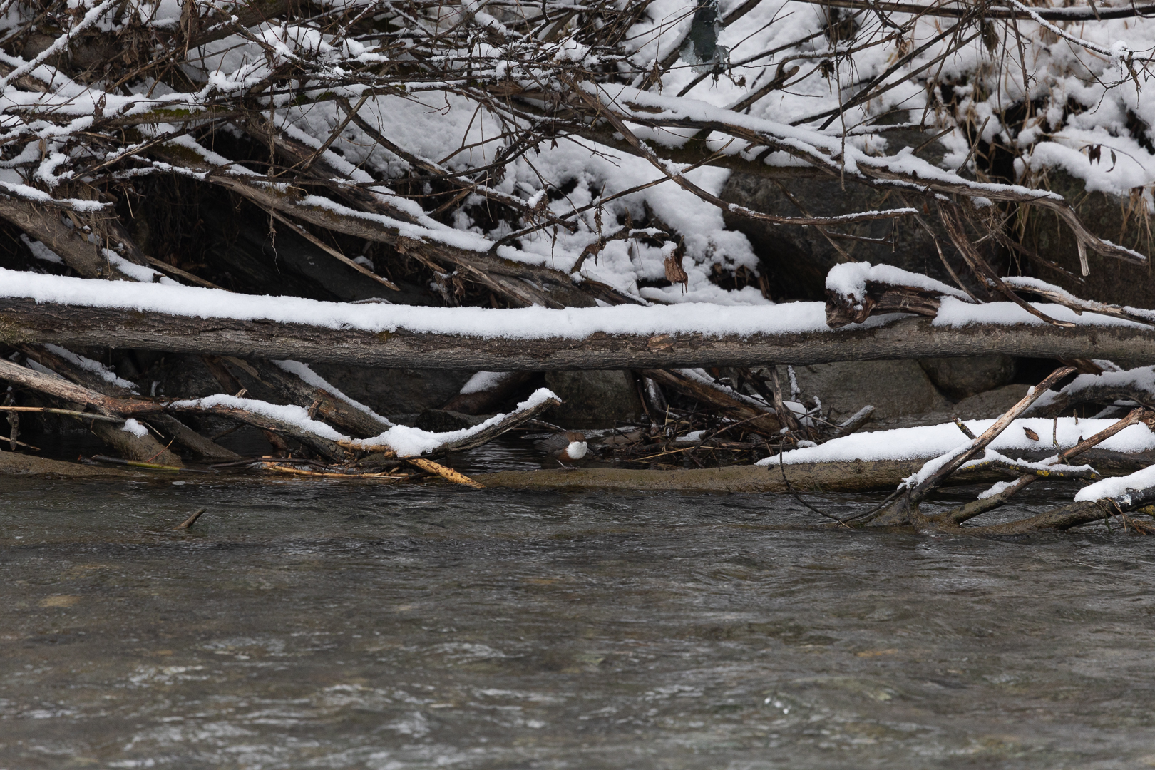 Waterspreeuw (Cinclus cinclus) en dan de alpen ondersoort aquaticus (Bruinbuikversie). Meest standvogel, soms in Nederland. De Noordelijke soorten hebben die bruine band niet. Geleidelijke overgangen komen voor. Broedt langs ondiepe, snelstromende wateren. Duikt onder water om het voedsel te zoeken en loopt op de bodem. Kleine staartje omhoog en die drukt hem naar beneden. Ook de vleugels gebruikt hij/zij. Aan de Gail rivier in Oostenrijk, nabij Rattendorf.