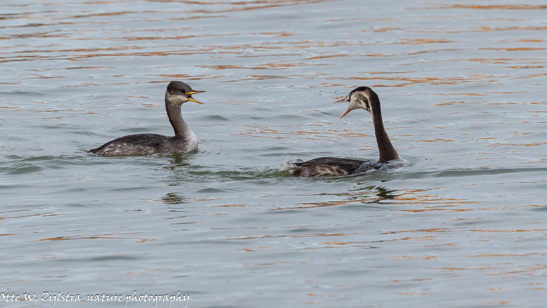 Vorige week op doorreis naar Drenthe even een stop gemaakt bij Den Oever; daar zou een Roodhalsfuut moeten zitten. En die vond ik weer terug. Eerst dobberde hij wat veraf, maar hij/zij kwam dichterbij en begon te duiken. kennelijk zat daar vis want er ging ook een Fuut (alles in winterkleed) naar toe. Dan verwacht je een confrontatie en ondanks dat de (gewone) Fuut gemiddeld iets groter is, had hij toch wel respect voor zijn neef die met enkele tientallen exemplaren bij ons overwinterd, liefst op zout water. Je kunt nu de kenmerken mooi vergelijken; opvallend de gele snavel bij de Roodhalsfuut.